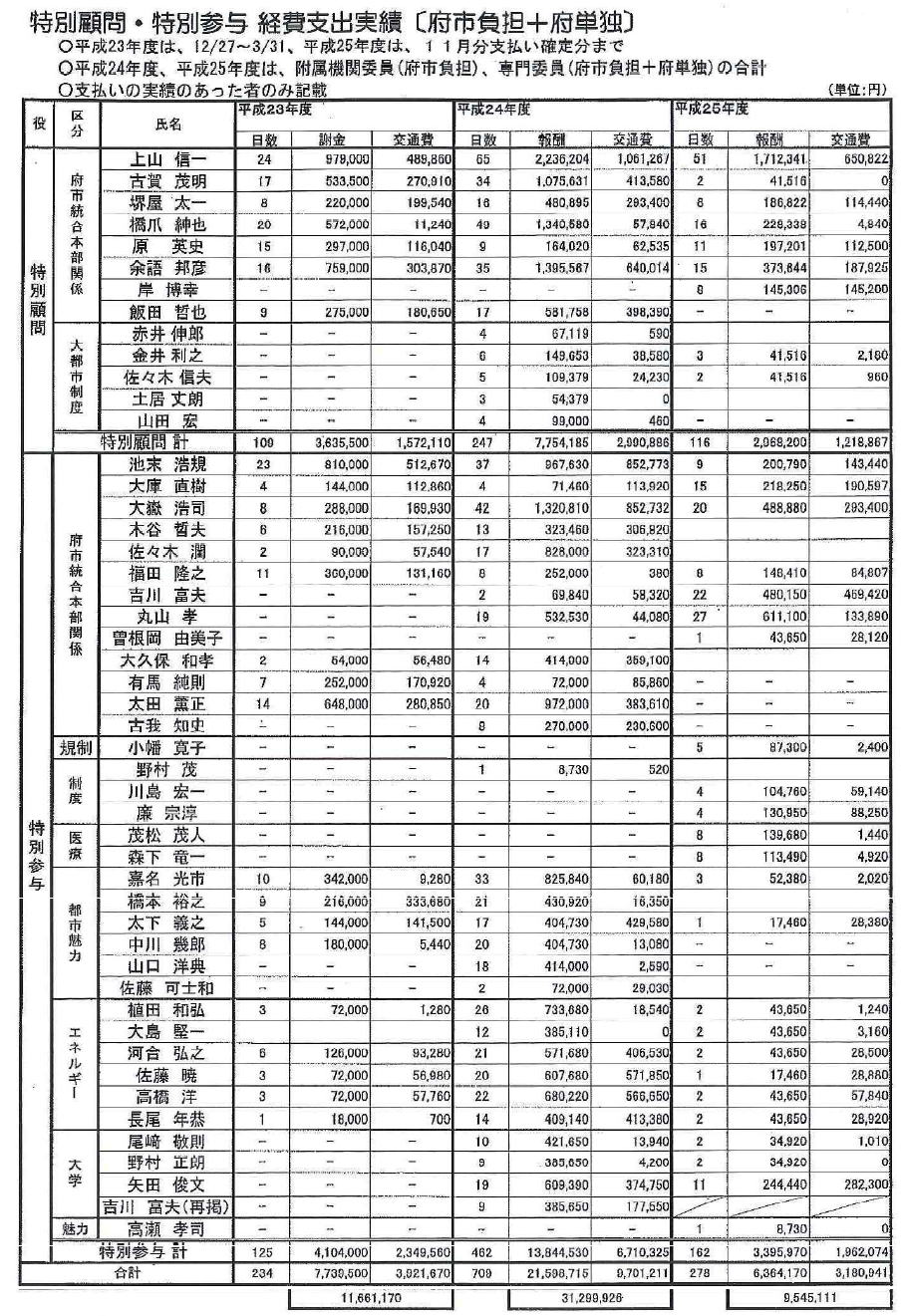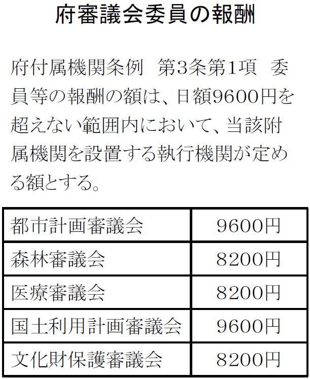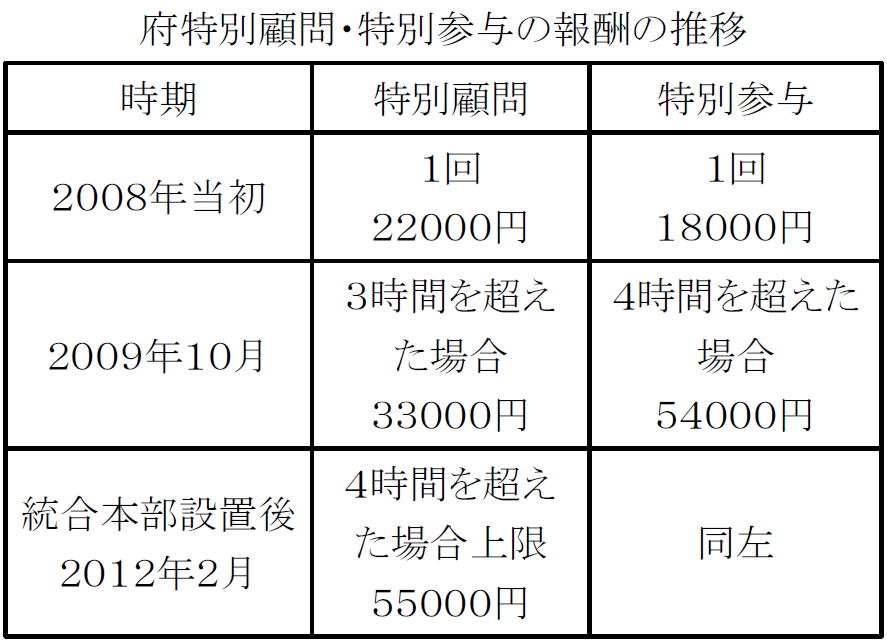 | 1日の報酬5万5000円 審議会委員の5.7倍 特別顧問・参与がどんな活動をしているのかの情報公開に、松井知事は後ろ向きです。 特別顧問・参与の1日当たりの報酬は上限55000円、審議会委員の9600円の5.7倍ですが、その活動や報酬の受取方については不透明さが指摘されています。 たとえば府市で特別顧問を務める堺屋太一氏は、2012年3月、維新政治塾に出席したあと府市統合本部の都市魅力戦略会議に出席、東京からの交通費2万9千円を受け取りました。 別の大阪市の特別顧問は、維新政治塾で講師を務め、市幹部が政治塾の会場で意見交換、報酬を受取り。 東京の事務所での打ち合わせにも高額報酬が支払われています。 自民党は、2月議会に、特別顧問らがどんな活動をしているかの情報公開を求める「府情報公開条例改正案」を提出、5月議会に継続審査となっていました。 ところが、松井知事は、情報公開の範囲を限定、職員が同席する打ち合わせや会合は公開の対象から外すという別の同条例改正案を知事提出してきました。 自民案つぶしという意図は明らかでした。自民案が可決されると知事は、地方自治法上の拒否権を発動、特別顧問らの活動の情報公開は押しつぶしました。 フルオープンを掲げる知事ですが、それは都合の良い場合という、本質を覗かせると同時に、維新政治推進の根幹部分だからだとの見方も出来ます。 |